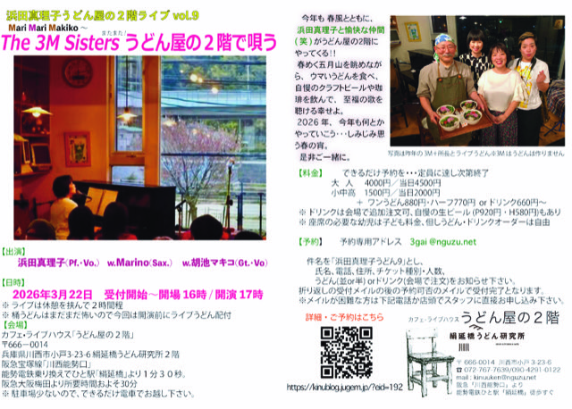 2026年3月22日(日)浜田真理子屋の2階ライブvol.9 Mari Mari Makiko 〜 The 3M Sisters